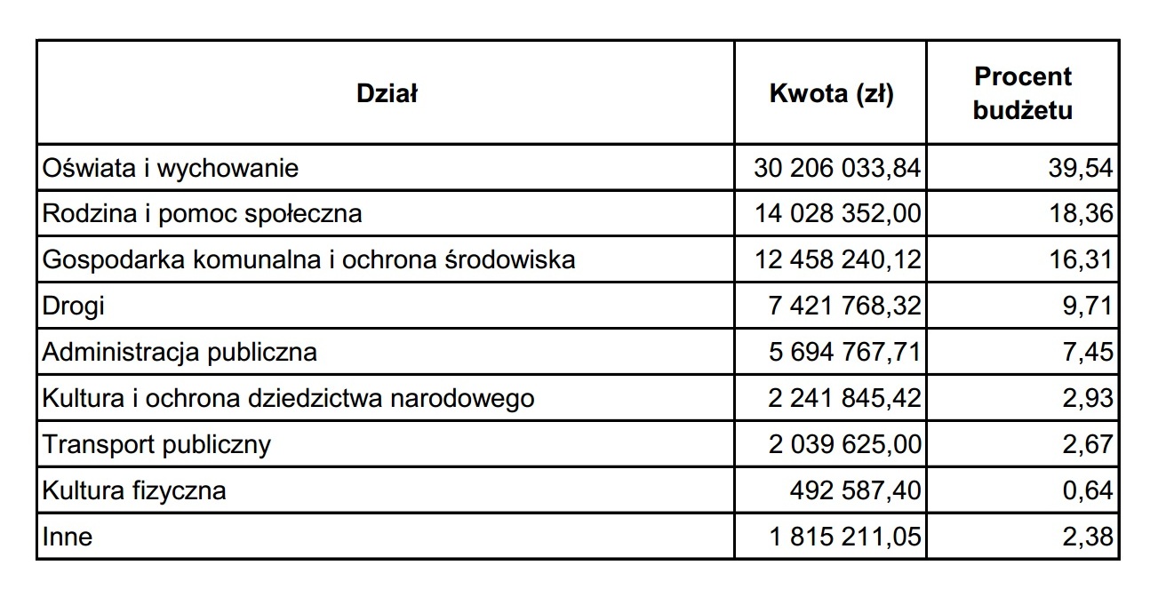 Największe wydatki Gmina poniesie w związku z oświatą i wychowaniem – łącznie ponad 30 mln zł, co stanowi prawie 40% budżetu. Kolejna pozycja to rodzina i pomoc społeczna – ponad 14 mln zł. W tej kwocie 11,7 mln to świadczenie wychowawcze, czyli program 500+.