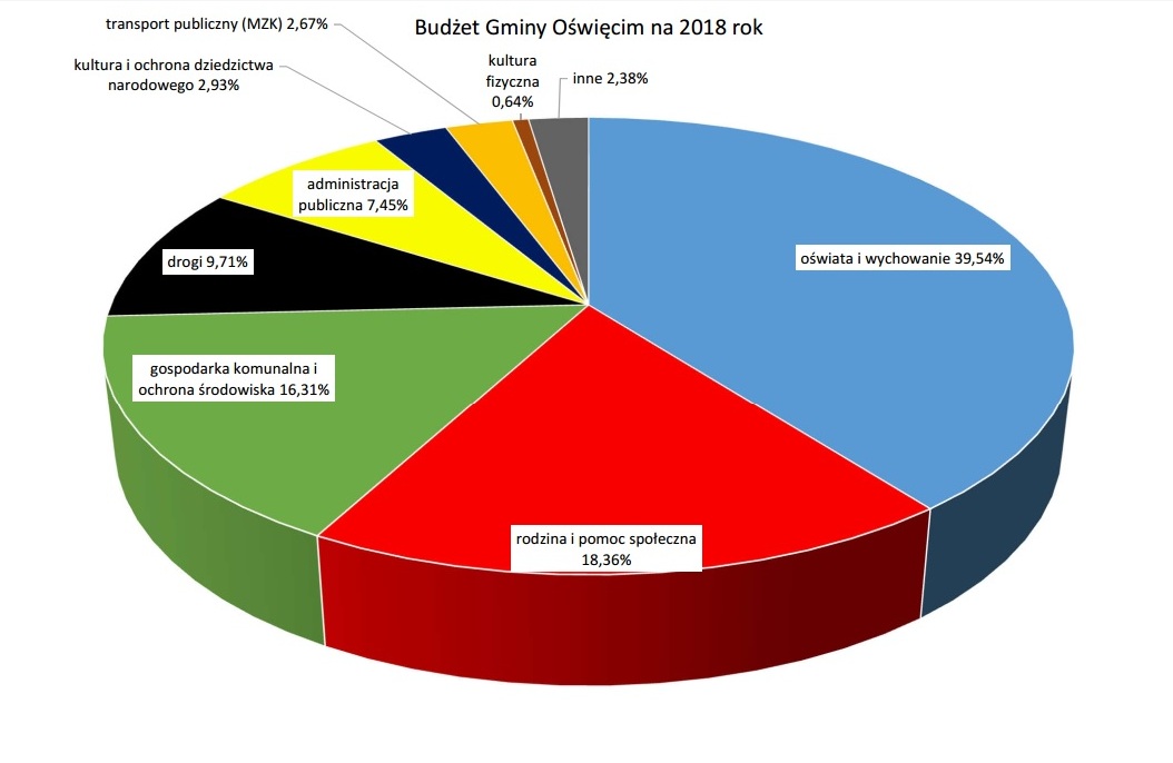 Administracja publiczna będzie kosztować w 2018 roku ok. 5,7 mln. zł. W tej kwocie zawiera się ok. 3,9 mln zł na funkcjonowanie Urzędu Gminy. Na kulturę i ochronę dziedzictwa narodowego zaplanowano ponad 2,2 mln zł, z czego ok. 1,5 mln zł na Ośrodek Kultury, Sportu i Rekreacji oraz prawie 0,5 mln zł na Gminną Bibliotekę Publiczną. Ponad 2 mln zł to dofinansowanie transportu publicznego, czyli podmiejskich autobusów, które kursują przez nasze miejscowości. Natomiast na kulturę fizyczną Gmina Oświęcim wyda niemal 0,5 mln zł.