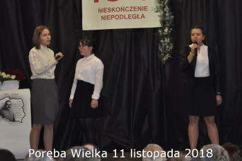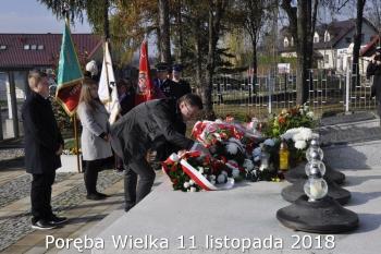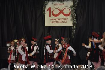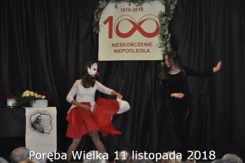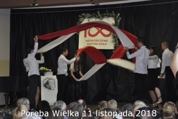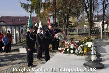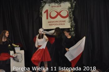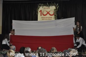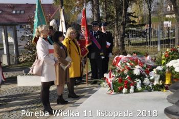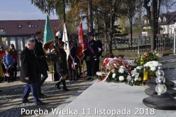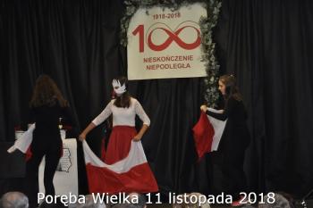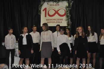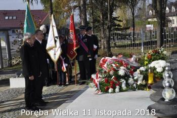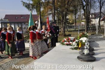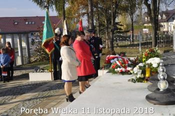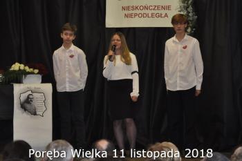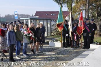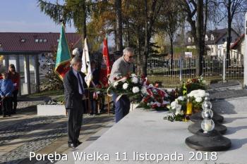 Gminne obchody Narodowego Święto Niepodległości zorganizowały w Porębie Wielkiej rozpoczęły się uroczystym nabożeństwem w kościele św. Bartłomieja. Następnie przedstawiciele władz Gminy, sołectwa i samorządowych instytucji, a także delegacje szkół i miejscowych organizacji oddały hołd poległym i pomordowanym w czasie wojen światowych, składając kwiaty na pomniku. Kilka minut przed południem wszyscy uczestnicy ceremonii zgromadzili się w Domu Ludowym, żeby punktualnie o 12:00 przyłączyć się do chóru rodaków rozsianych na sześciu kontynentach, śpiewających Narodowy Hymn.